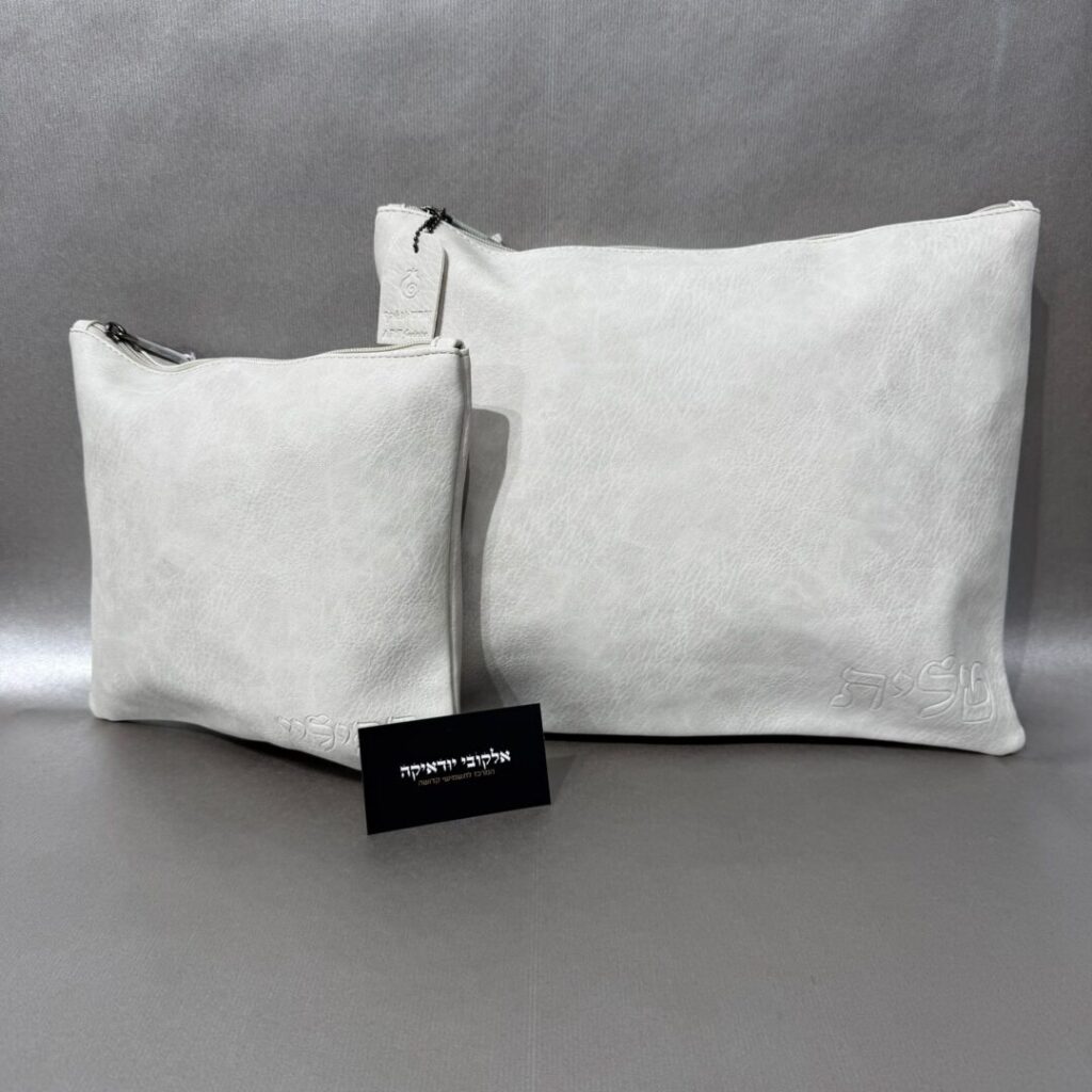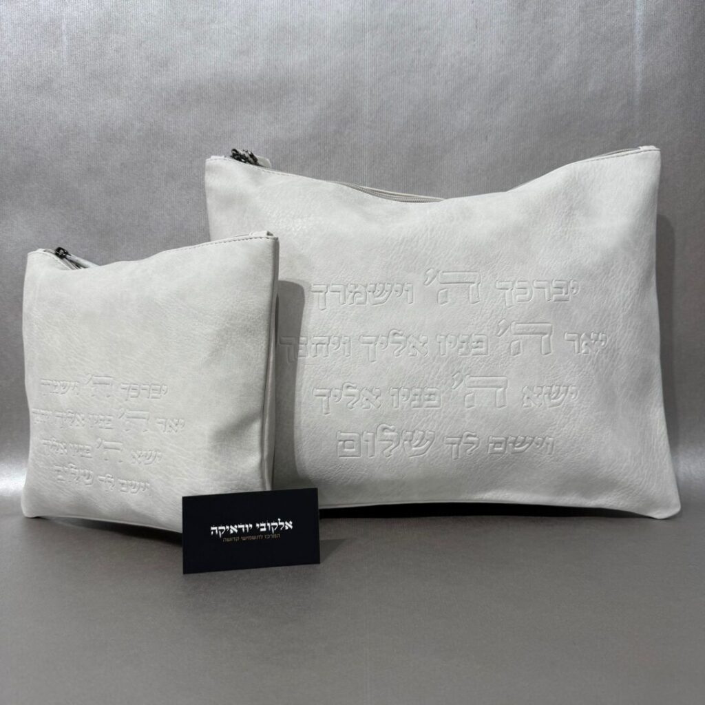 סט טלית תפילין דמוי עור לבן אותיות שקועות "יברכך"